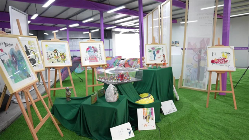 亞殘運(yùn)場館、中國元素、飛飛形象、杭城美景……這些畫作和手工制品內(nèi)容豐富、形態(tài)各異,有各類繪畫、傘面彩繪、盤繪、剪紙、黏土制品等等,鮮亮的色彩搭配相當(dāng)搶眼,讓人一看就心情愉悅。
