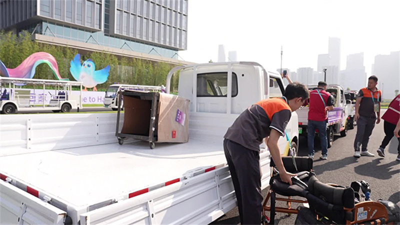 由于殘疾運動員的行李相對較多,大件行李的比例也比較高,還包括輪椅等輔助器具,需要小心保護,不能磕碰,亞殘運村運行團隊從各中心緊急抽調40余名“精兵強將”為運動員提供抵離服務。大家一方面做好引導工作,陪同運動員和隨隊官員們順利通過安檢,另一方面將隨車行李和行李車上的大件行李搬運下來,運送至行李安檢口。在運動員們進行抵達登記的同時,這些行李已經(jīng)通過了安檢。此時,一條行李運送人力“流水線”形成了:工作人員相互接力,將行李快速運送至“村”內(nèi)行李車。這樣一來,運動員不用奔波勞頓,無需親自動手,體驗“無感服務”,不知不覺間就與自己的行李一同來到了居住區(qū),美妙的“村生活”即刻開啟。
