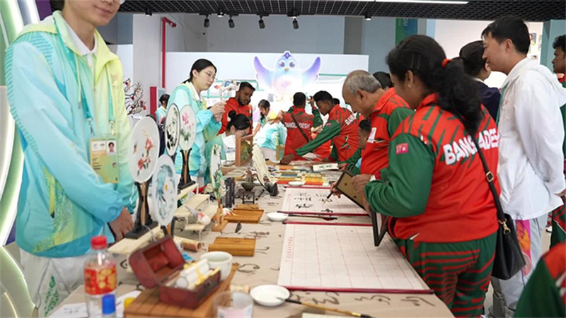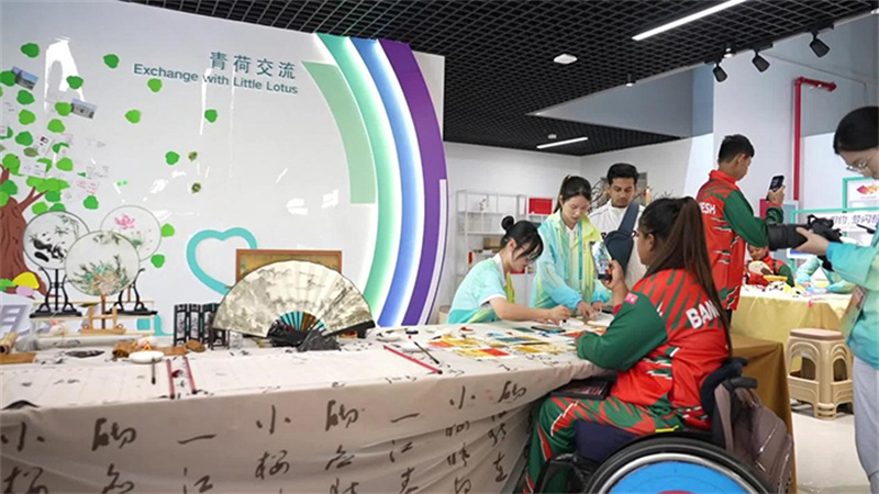 品嘗過美食,想要放松心情,志愿服務中心是個好去處。孟加拉國代表團的運動員們,正在“小青荷”的引導下參觀志愿服務文化展、體驗各類互動活動。