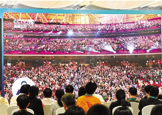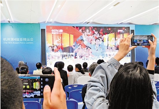 10月22日晚,杭州第4屆亞殘運會主媒體中心,中外媒體記者一起收看、報道亞殘運會開幕式。圖為中國代表團(tuán)入場,大家舉起手機拍攝。記者 徐彥 攝