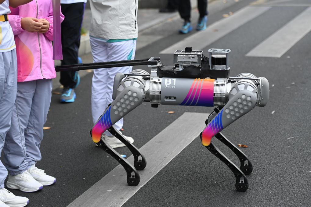 10月19日,火炬手蔡瓊卉在智能導盲犬的引導下進行火炬?zhèn)鬟f。這是智能導盲犬首次在大型賽事火炬?zhèn)鬟f中亮相,它以四足智能機器人視覺識別能力引導視障殘疾人行走。新華社記者黃宗治攝