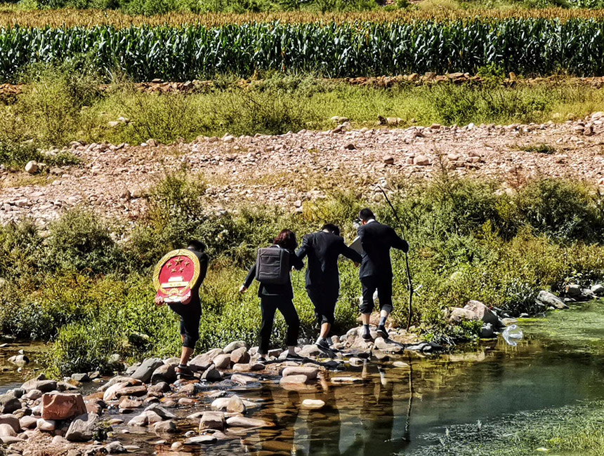 王世廣(左一)與同事入村進(jìn)行案件回訪。魏振敏攝
