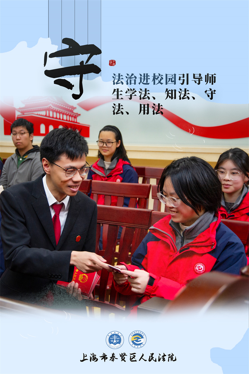 在上海市奉賢法院奉城法庭的法治進校園教學點——奉城鎮(zhèn)曙光中學內(nèi),法官助理正在向高二的同學們分發(fā)憲法宣傳冊,并通過釋法析理引導同學們學法、知法、守法、用法,在心中播下法治的種子。