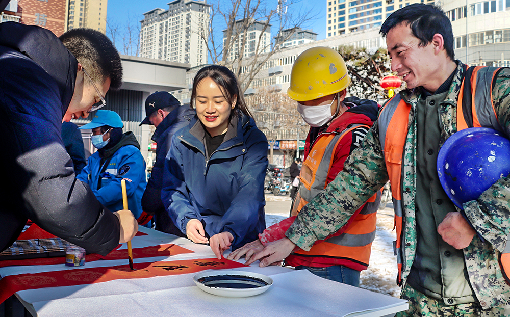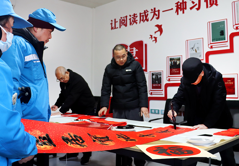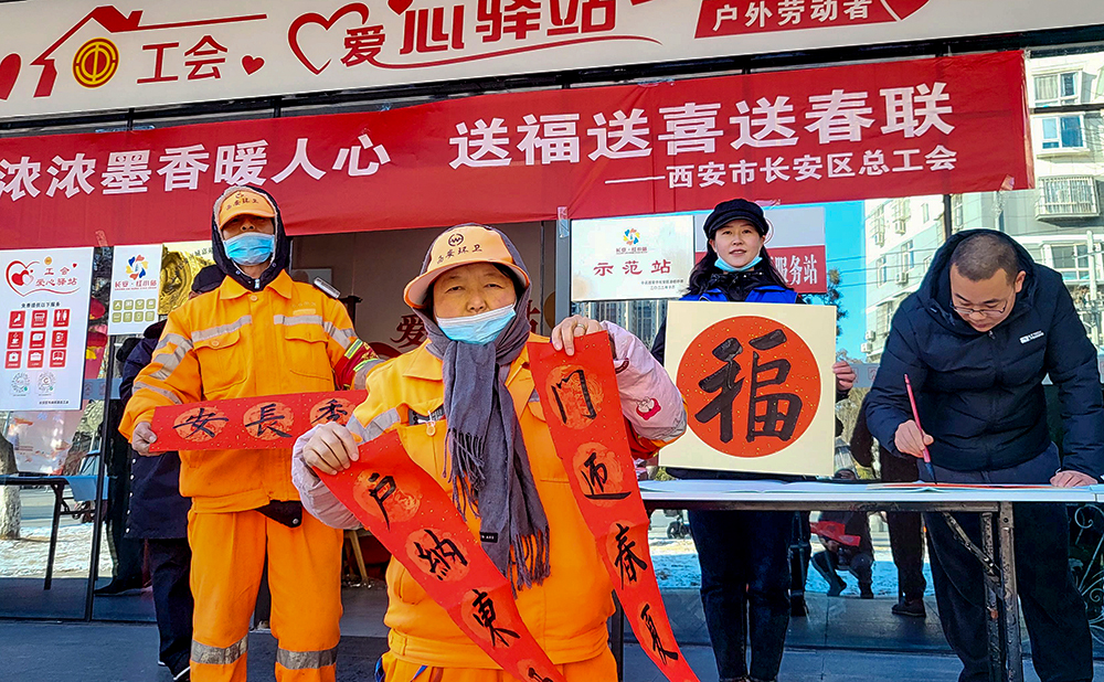 活動(dòng)現(xiàn)場(chǎng),長(zhǎng)安區(qū)總工會(huì)邀請(qǐng)的多位知名書(shū)法家現(xiàn)場(chǎng)揮毫潑墨,把對(duì)新春的美好愿望傾注筆尖,書(shū)寫(xiě)出一副副寓意美好、包含祝福的春聯(lián)和“?!?。驛站周邊的環(huán)衛(wèi)工人、停車(chē)收費(fèi)員,快遞小哥及市民群眾,高興地挑“福”字、選春聯(lián),提前感受到了濃濃的“年味”