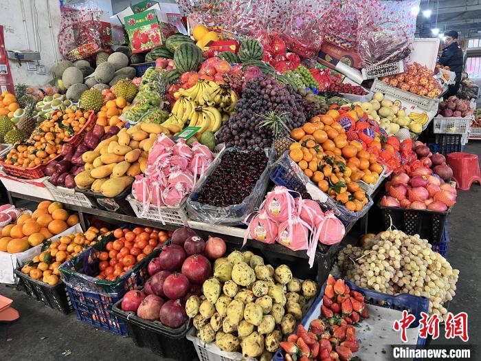 來到當?shù)刂牟└窭r(nóng)貿(mào)市場,只見各類水果早已堆滿貨架,靜待市民“置年貨”。張峰 攝