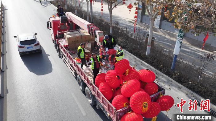 為喜迎春節(jié),營造“年味兒”,阿圖什城建局工作人員早早動工,為當?shù)馗鱾€街道張燈結(jié)彩掛燈籠。張峰 攝