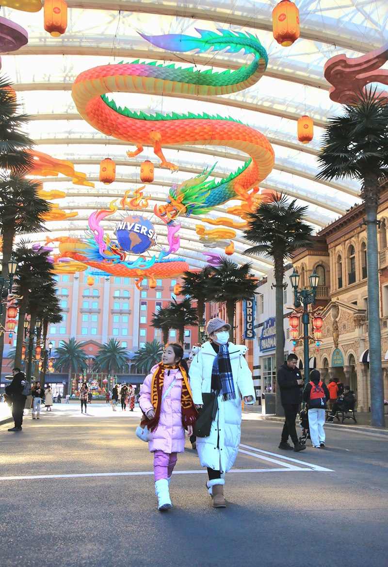 1月27日,也是北京環(huán)球度假區(qū)開啟“環(huán)球中國年”主題活動首日,眾多游客前來打卡,記者在現(xiàn)場看到,在全新的環(huán)球新春廣場,“年來啦”特別演出上演新春大聯(lián)歡,環(huán)球新春廣場集市包羅萬象,火熱新年味正濃。來自照明娛樂的小黃人、來自夢工場動畫《馬達加斯加》的朱利安國王、阿歷克斯和歌莉雅,以及阿寶、悍嬌虎和美美等十余位大片世界明星角色和約50名演員一起,以“驅(qū)趕年獸歡度春節(jié)”為故事線,帶游客回歸熱鬧的過年場景。