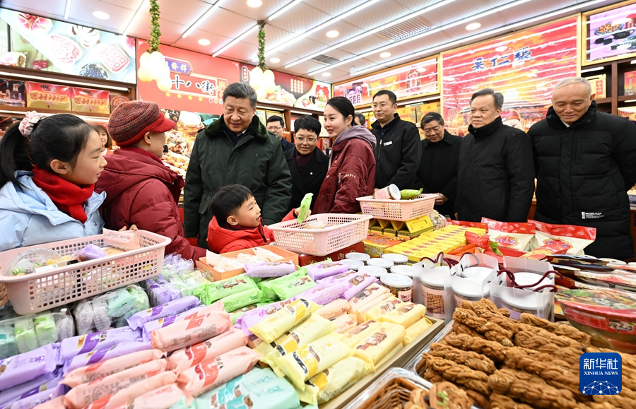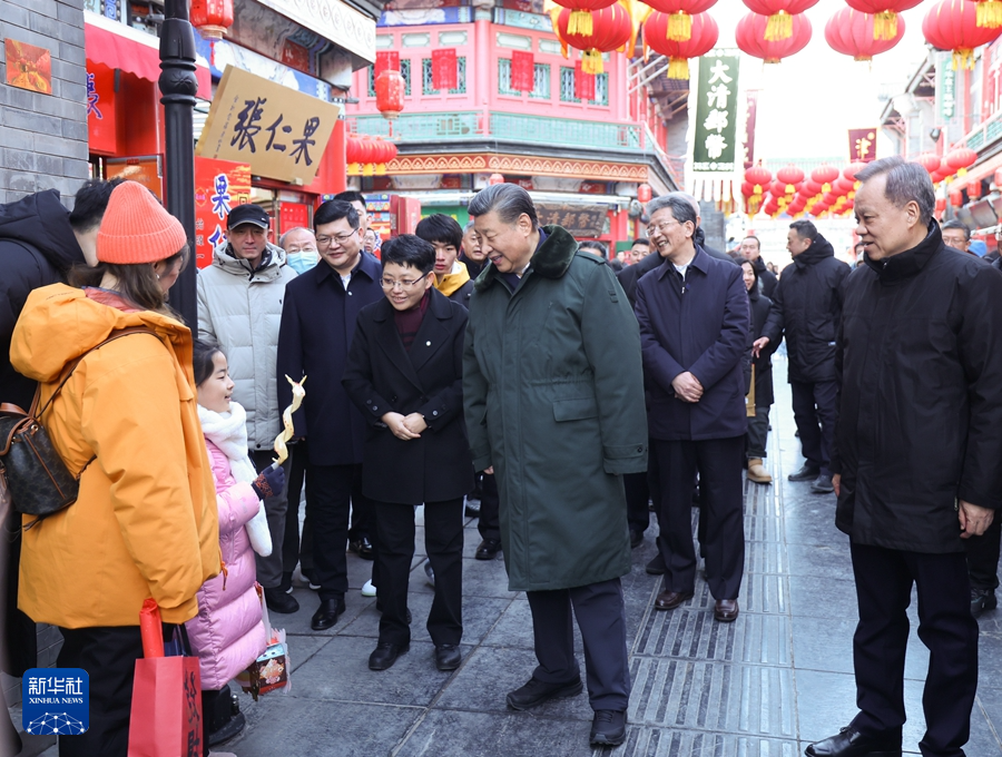 當(dāng)天下午,習(xí)近平來到天津古文化街。街道古色古香,習(xí)近平沿街步行,先后走進(jìn)桂發(fā)祥十八街麻花、果仁張、泥人張、楊柳青年畫等特色店鋪,了解產(chǎn)品種類、銷售和傳統(tǒng)文化傳承發(fā)展等情況,同店鋪業(yè)主、員工和現(xiàn)場群眾互動(dòng)交流。他說,各級黨委和政府要加強(qiáng)節(jié)日期間民生商品的產(chǎn)銷保供,確保數(shù)量充足、品類豐富、質(zhì)量可靠,讓廣大群眾放心消費(fèi)、快樂過年。習(xí)近平指出,中國式現(xiàn)代化離不開優(yōu)秀傳統(tǒng)文化的繼承和弘揚(yáng),天津是一座很有特色和韻味的城市,要保護(hù)和利用好歷史文化街區(qū),使其在現(xiàn)代化大都市建設(shè)中綻放異彩。