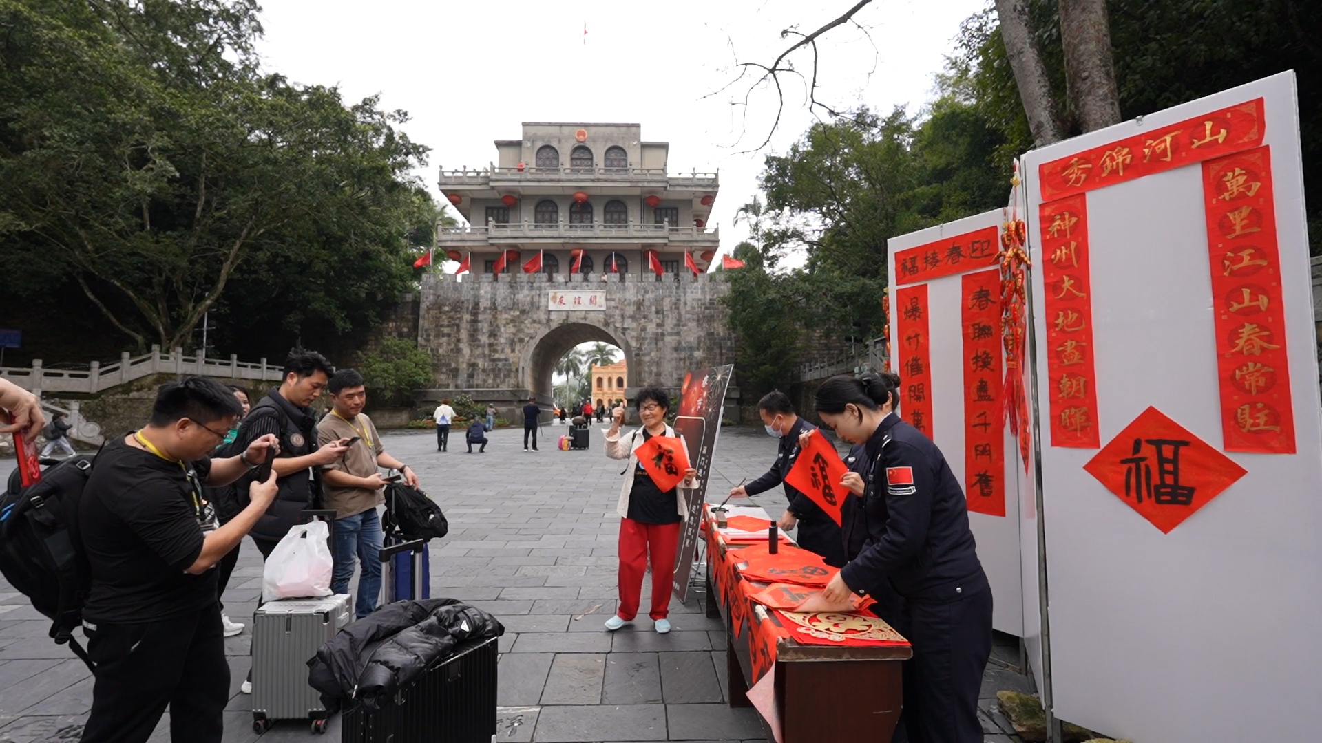 2月2日9時,千年雄關(guān)友誼關(guān)前人頭攢動,出入境旅客絡(luò)繹不絕,一片熱鬧的景象。廣西出入境邊防檢查總站友誼關(guān)出入境邊防檢查站移民管理警察在此為廣大旅客寫對聯(lián)送福字。