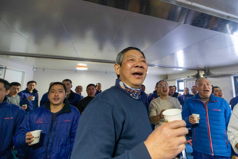 中國(guó)第40次南極考察隊(duì)員在年夜飯上舉杯。新華社記者周圓 攝