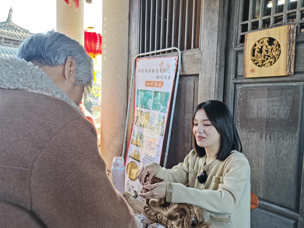 2月11日,陳嘉在木雕展位前為游客介紹產(chǎn)品。新華社記者詹奕嘉 攝