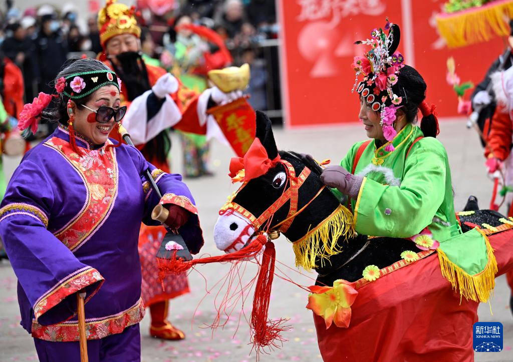 2月20日,在寧夏銀川市,參賽社火隊(duì)的演員為市民表演傳統(tǒng)社火項(xiàng)目(無人機(jī)照片)。