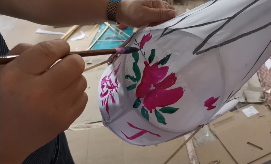 周芙明常用紅、綠、藍(lán)、黃幾種顏色。這樣畫(huà)出來(lái)的燈籠五彩斑斕,很是醒目。上好色、晾曬好的燈籠仍然少頭缺尾,此時(shí)再用彩帶纏至“雞尾”,糊上用紙做成的“雞冠”,這才算是大功告成。