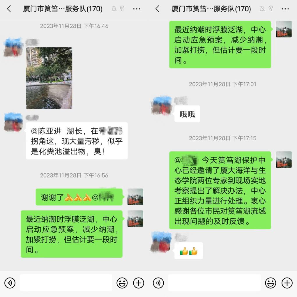 “你看,微信群里有人反映小區(qū)門口的湖水里有疑似化糞池溢出物,我們核實后啟動了應(yīng)急預(yù)案,筼筜湖保護(hù)中心邀請專家實地考察后給出了解決方案?!标悂嗊M(jìn)指著手機(jī)屏幕向記者介紹道。在這個名為“廈門市筼筜藍(lán)志愿服務(wù)隊”的微信群中,時不時有人@湖長反映問題,“這些都是我們志愿服務(wù)隊的骨干,他們發(fā)現(xiàn)問題就@我,我上報給筼筜湖保護(hù)中心,由他們來解決問題。”