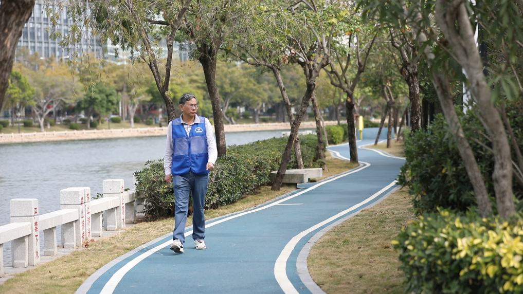 上午八點半,陳亞進(jìn)走出家門,乘公交車前往白鷺洲公園東公園巡湖。從東公園走到西公園,抵達(dá)位于西公園的筼筜湖保護(hù)中心,是他每次巡湖的基本路線。“有時起得早我就早點來,有時候白天忙就晚上再來。西公園晚上很熱鬧,散步、健身、唱歌、跳舞樣樣都有?!标悂嗊M(jìn)說。
