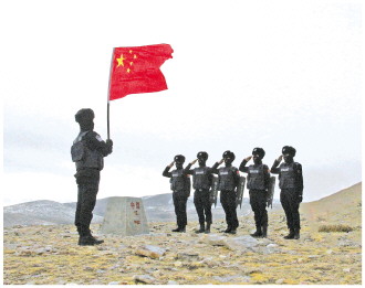 圖為霍爾邊境派出所民警在界樁前向國(guó)旗敬禮。