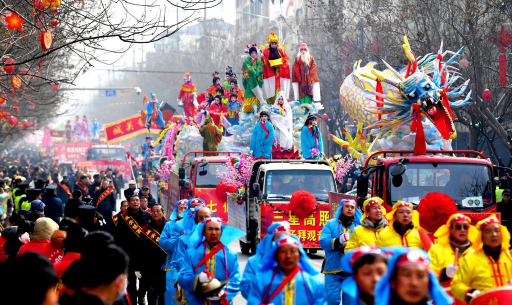 2月24日,陜西省寶雞市隴縣元宵節(jié)社火巡游活動上,群眾在觀看車社火。 新華社記者 劉瀟 攝