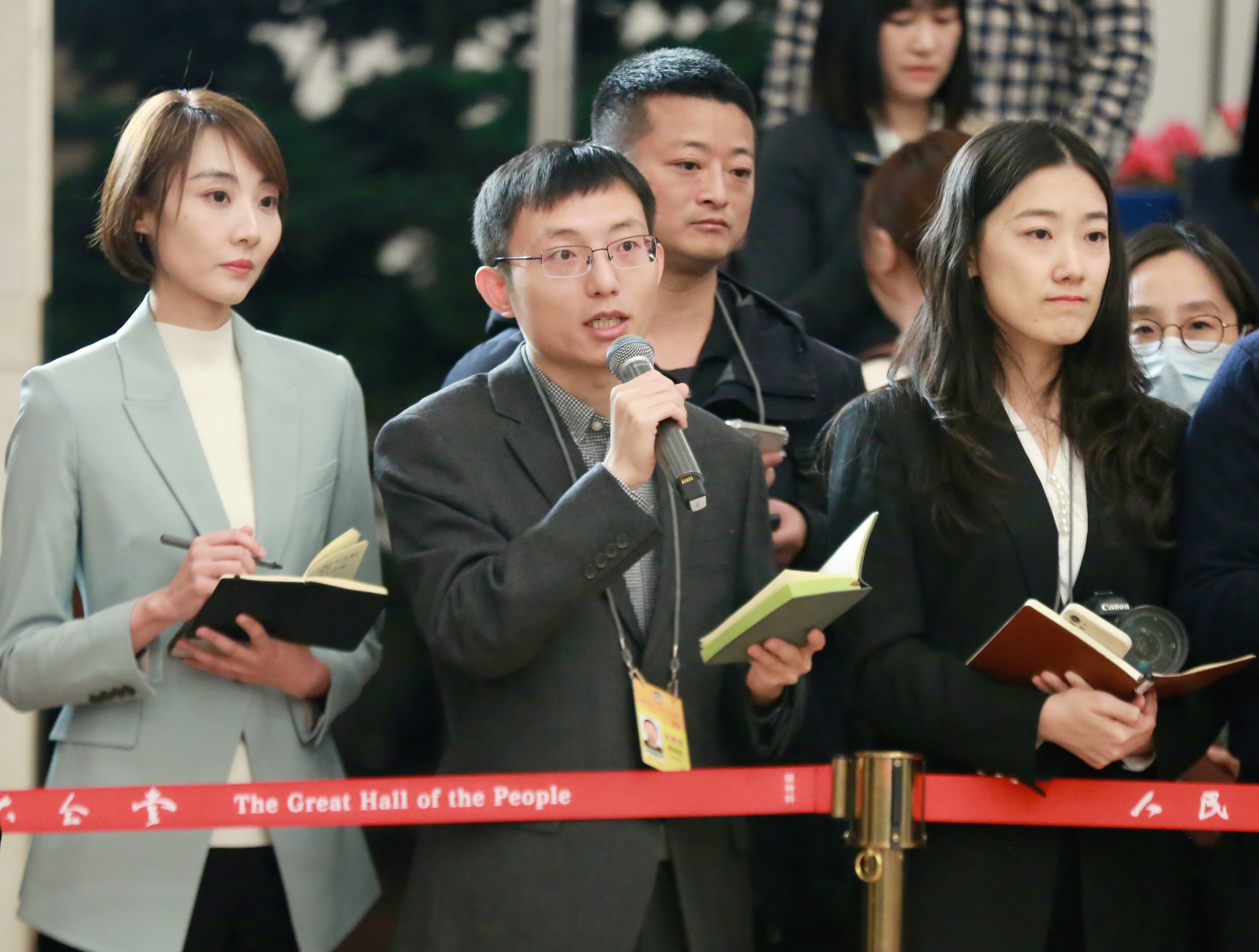 全國政協(xié)十四屆二次會(huì)議3月4日舉行首場“委員通道”采訪活動(dòng)。圖為本報(bào)記者提問。 本報(bào)記者 徐偉倫 攝