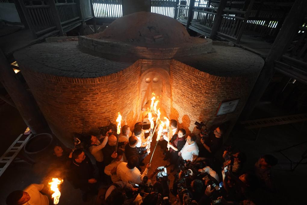 2023年10月19日,嘉賓與把樁師傅一起對葫蘆窯進行復燒點火。當日,作為2023中國景德鎮(zhèn)國際陶瓷博覽會的活動之一,景德鎮(zhèn)古窯民俗博覽區(qū)對重建的明代葫蘆窯進行點火復燒。同時,景德鎮(zhèn)歷代瓷窯活態(tài)傳承紀實館開館。新華社記者 周密 攝
