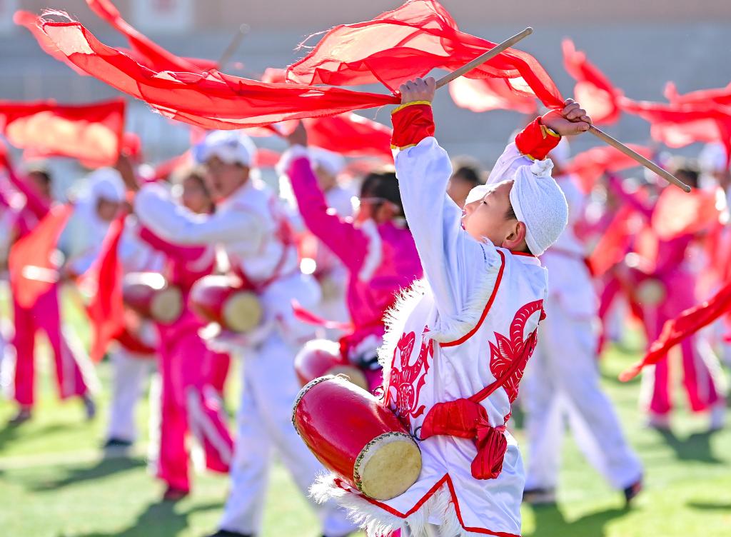 2023年11月16日,內蒙古鄂爾多斯市鄂托克前旗第二小學的學生在大課間表演安塞腰鼓。該校將安塞腰鼓列入學校的校本課程和大課間活動,聘請民間藝人傳授技藝,讓非遺文化在校園中傳承。新華社發(fā)(王正攝)