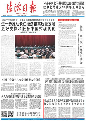 會(huì)議強(qiáng)調(diào),要堅(jiān)持不懈用黨的創(chuàng)新理論凝心鑄魂,在融會(huì)貫通、學(xué)悟篤行習(xí)近平法治思想和習(xí)近平文化思想上采取更多硬實(shí)舉措。要加強(qiáng)宣傳思想文化領(lǐng)域行政立法,加快完善相關(guān)法律法規(guī)體系。要堅(jiān)定文化自信,深入推進(jìn)社會(huì)主義法治文化建設(shè),加強(qiáng)中華優(yōu)秀傳統(tǒng)法律文化保護(hù)、宣傳和傳承,弘揚(yáng)社會(huì)主義核心價(jià)值觀和法治精神。要扎實(shí)做好法治新聞宣傳,講好法治故事,鞏固壯大主流思想輿論,守好意識(shí)形態(tài)陣地。要以釘釘子精神落實(shí)全國宣傳思想文化工作會(huì)議部署,立足職能為在新的歷史起點(diǎn)上繼續(xù)推動(dòng)文化繁榮、建設(shè)文化強(qiáng)國、建設(shè)中華民族現(xiàn)代文明提供有力法治保障。