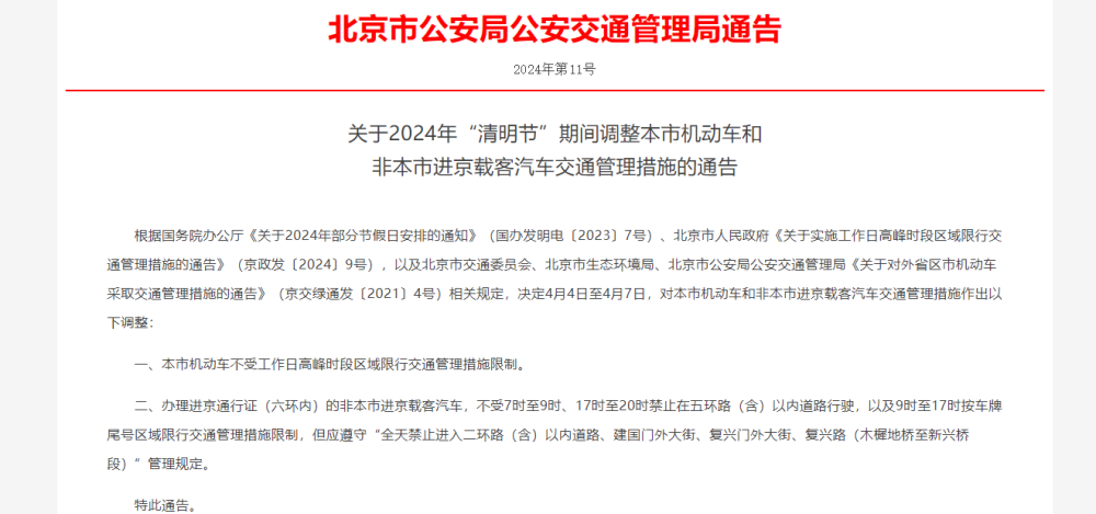 關(guān)于2024年“清明節(jié)”期間調(diào)整本市機(jī)動車和非本市進(jìn)京載客汽車交通管理措施的通告