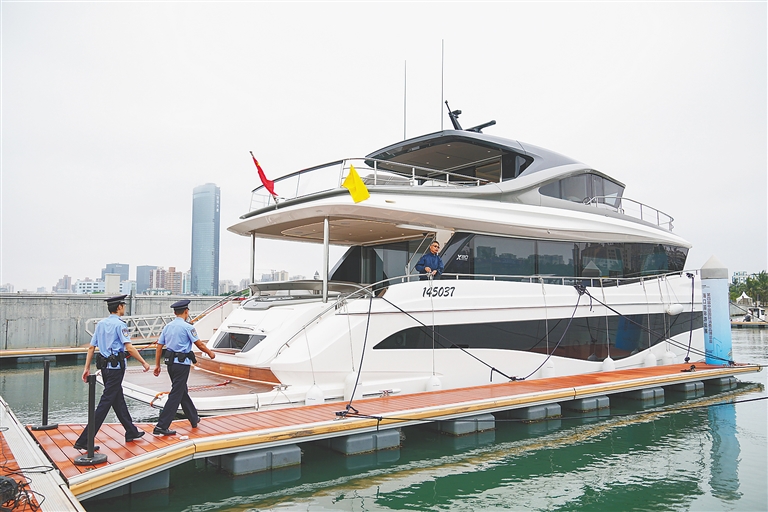 “這是本屆消博會首艘進境游艇展品,貨值超2800萬元?!焙?诟酆jP(guān)相關(guān)負(fù)責(zé)人表示,海關(guān)在通關(guān)現(xiàn)場設(shè)立“消博會通關(guān)綠色通道”,建立全天候服務(wù)機制,接受參展企業(yè)預(yù)約通關(guān),推出“隨到隨驗”等便利通關(guān)措施,保障進境展品實現(xiàn)“零延時”通關(guān)。
