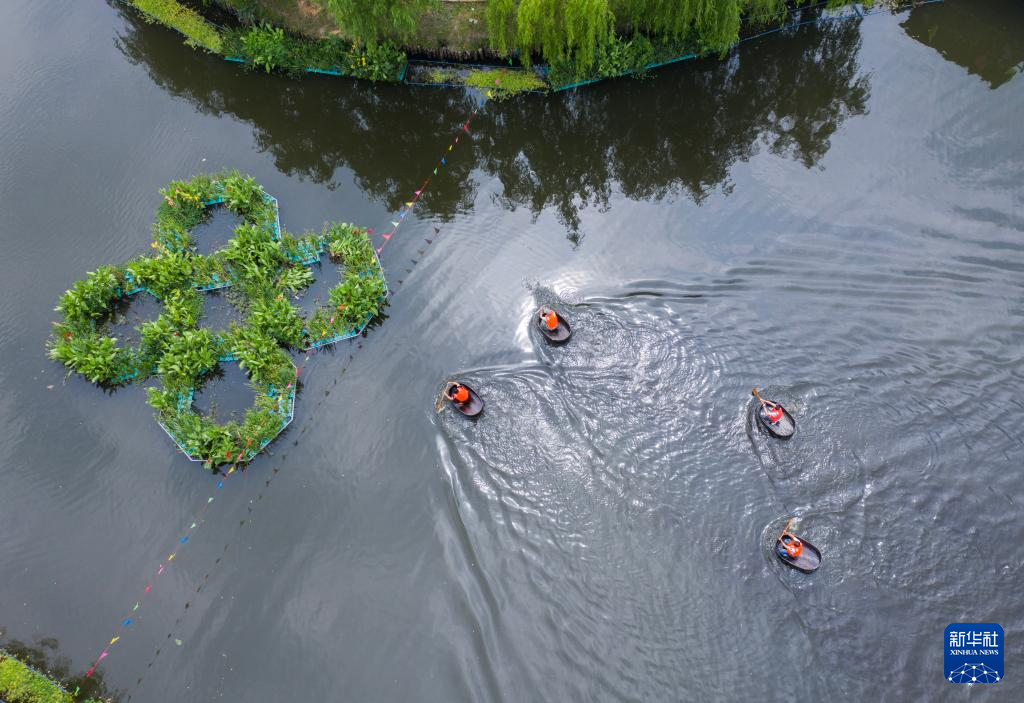 5月25日,村民們參加水鄉(xiāng)劃菱桶比賽。菱桶是河網(wǎng)密布的東林鎮(zhèn)百姓家中常見的一種傳統(tǒng)水上勞動工具,村民在捕魚、采菱、采荷時都要用到(無人機照片)。