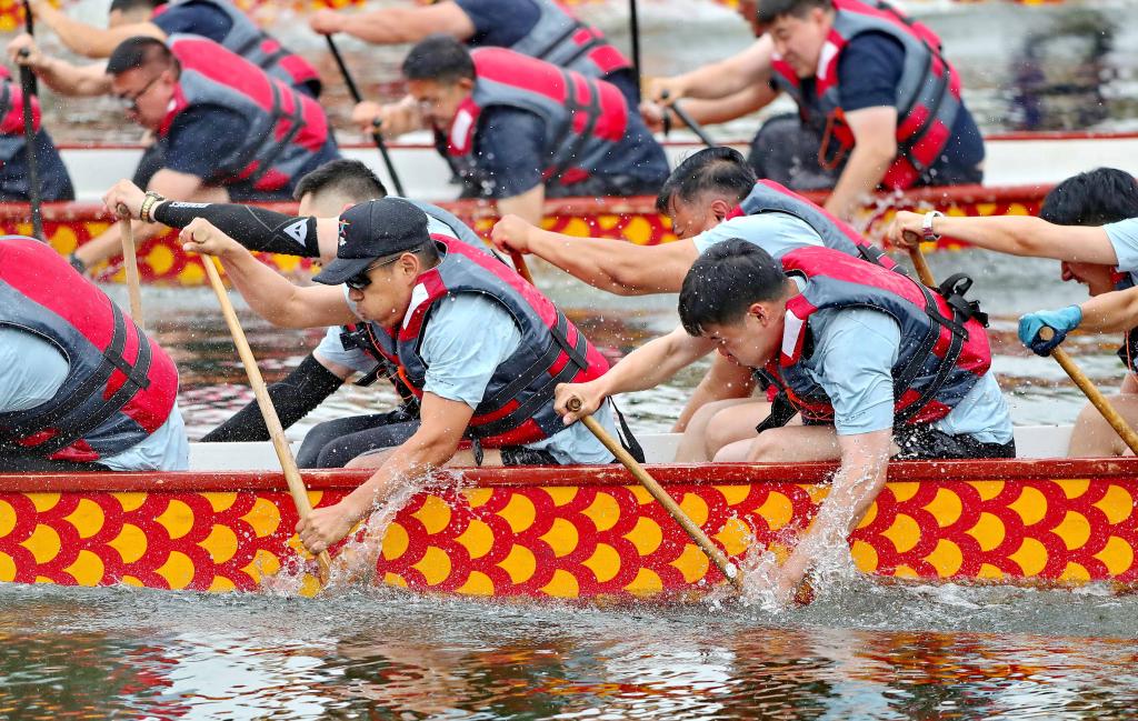 6月7日,河北省秦皇島市海港區(qū)湯河,參賽選手參加秦皇島第十屆龍舟大賽。新華社發(fā)(曹建雄 攝)