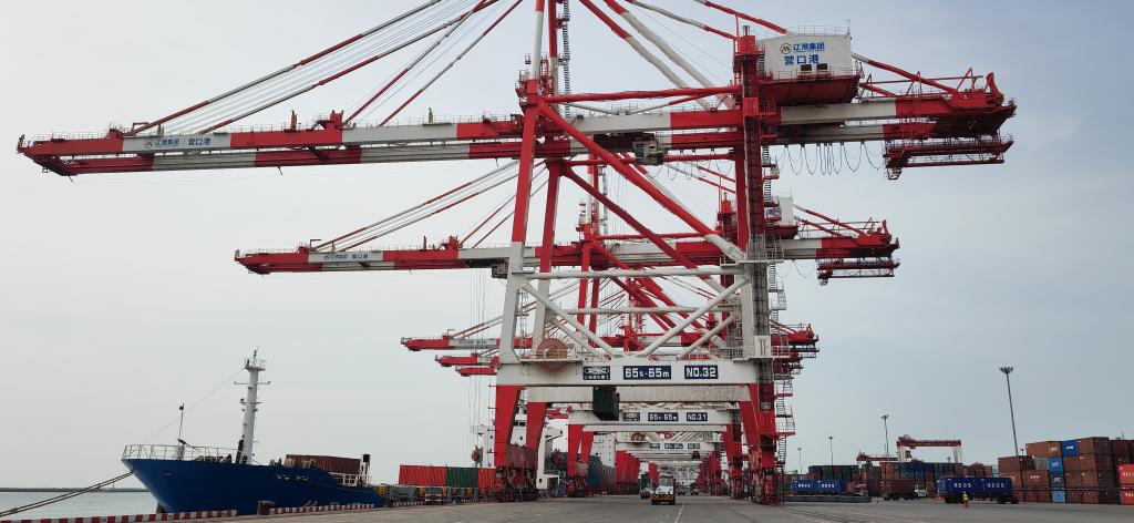 藍(lán)天碧海,波光粼粼。遼東灣畔的營口港集裝箱碼頭一派繁忙景象。巨型門式起重機(jī)將一個個集裝箱“抓”起,平穩(wěn)移至停靠在碼頭邊的貨輪上。堆場上,數(shù)量眾多的待發(fā)集裝箱整齊擺放,即將裝船出海。