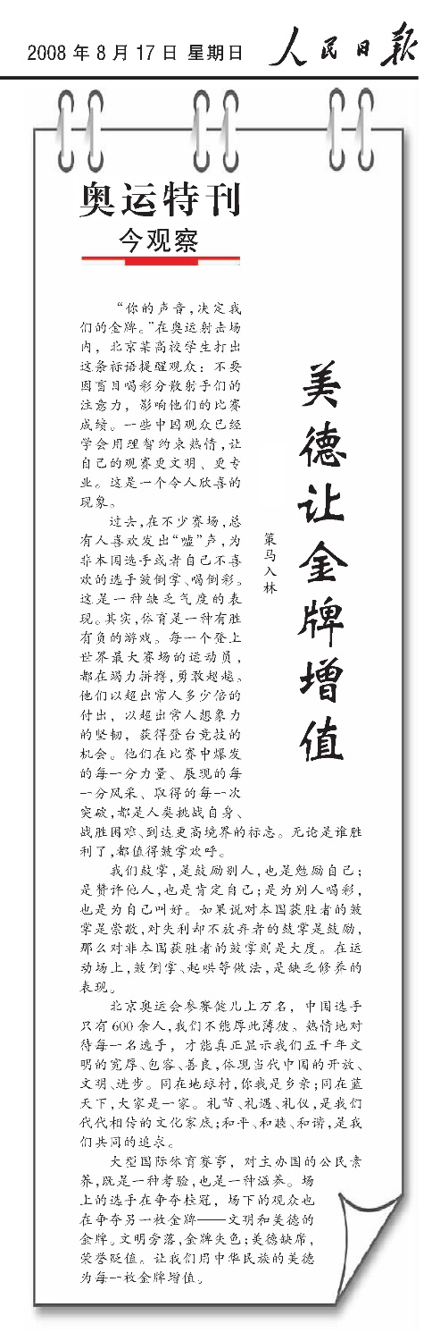 2008年8月17日,《人民日報(bào)》刊發(fā)博文《美德讓金牌增值》。