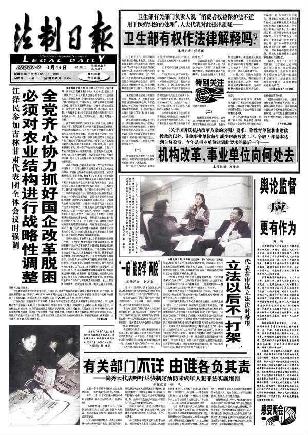 2000年九屆全國人大三次會議期間,我作為上會記者采寫《衛(wèi)生部有權(quán)作法律解釋嗎》,報道全國人大代表對衛(wèi)生部此前聲稱“消費者權(quán)益保護法不適用于醫(yī)療糾紛處理”很不理解,法學(xué)專家也不贊同,認為這種“聲明”具有法律解釋性質(zhì),衛(wèi)生部只能對自己頒布的規(guī)章等進行解釋,這個“聲明”并不具有法律效力。此報道刊于《法制日報》2000年3月14日一版報眼。次日又發(fā)追蹤報道《衛(wèi)生部向人大代表作解釋》。第三天衛(wèi)生部來人向本報作解釋,第三篇《衛(wèi)生部向本報作解釋》未能發(fā)出。