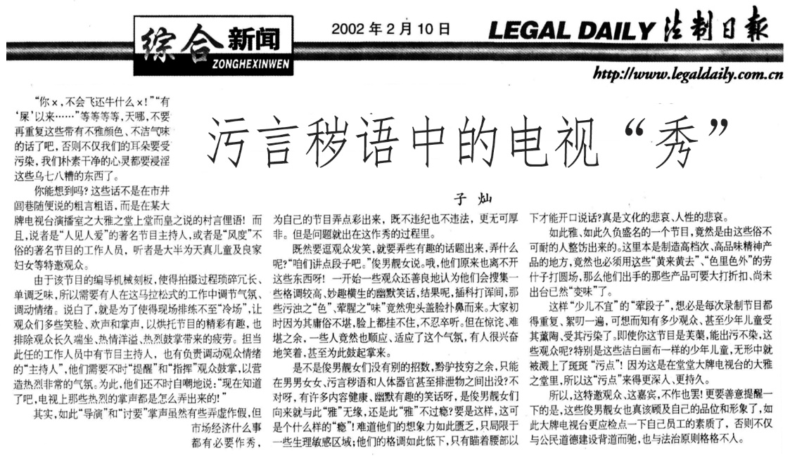 2002年2月10日,《法制日報》刊發(fā)《污言穢語中的電視“秀”》。