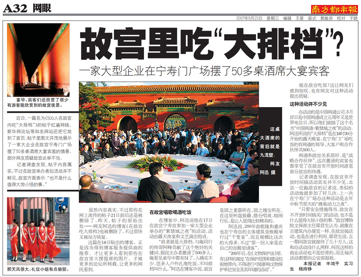 2007年5月17日,作為國務(wù)院新聞辦網(wǎng)絡(luò)局人員,受命參加當時中國網(wǎng)通公司在故宮搞的成立五周年活動,認為在重點文物保護單位大張旗鼓搞此種活動涉嫌違反文物保護法。遂將所拍部分照片配文,“故宮是國之重器所在,國之瑰寶所在,在這里杯盤狼藉、搭臺唱戲、喧鬧行樂,是讓人覺得比較稀奇的”,次日在新浪博客發(fā)出。新浪博客即以《大風(fēng)中故宮飯局龍門陣》為題推薦至首頁,閱讀量很快超過20萬,熱度較高。新華網(wǎng)發(fā)展論壇等轉(zhuǎn)推至首頁,《南方都市報》為此作了專題報道《故宮里吃“大排檔”?》,引起更大關(guān)注,人們普遍質(zhì)疑活動不當。
