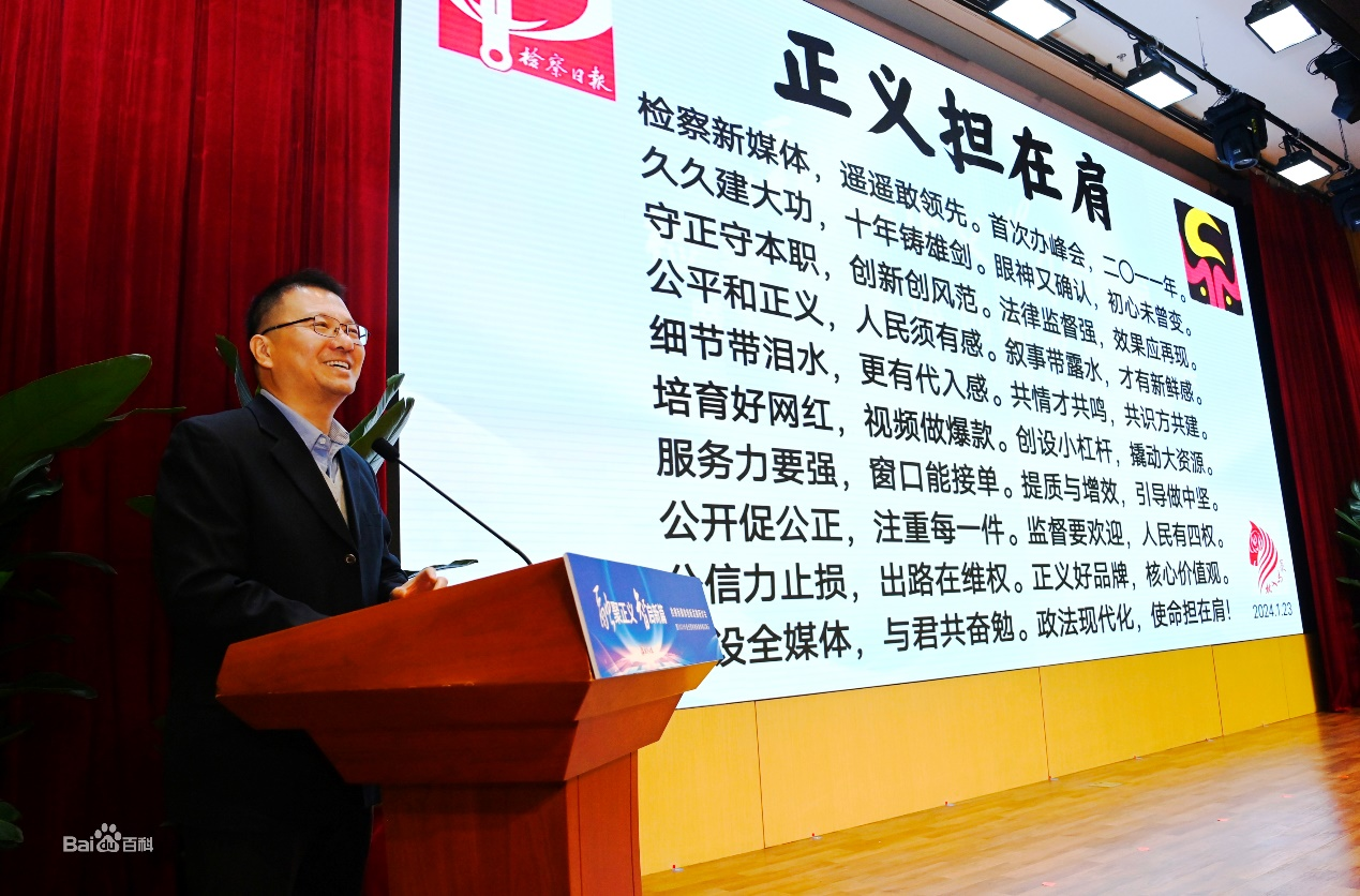 2024年1月23日,參加檢察新媒體創(chuàng)新發(fā)展研討會暨2023年度全國檢察新媒體精品展示活動,發(fā)言提出:我從2013年至今參加過6屆檢察日報社新媒體活動,是資深粉絲,有深厚感情。檢察日報社團結(jié)檢察機關(guān)新媒體同仁秉承“強化法律監(jiān)督維護公平正義”宗旨,久久為功,十年鑄劍,成功打造了“正義”新媒體融媒體品牌,令人備感振奮、備受鼓舞。在新時代新征程上,希望“正義”新媒體融媒體守正創(chuàng)新,注重共情共鳴,集結(jié)社會力量,通過短視頻等新傳播方式,充分呈現(xiàn)法律監(jiān)督效果,講好政法故事,增強傳播力服務(wù)力監(jiān)督力公信力,讓人民群眾在每一個司法案件中感受到公平正義。《正義擔(dān)在肩》:檢察新媒體,遙遙敢領(lǐng)先。首次辦峰會,二〇一一年。久久建大功,十年鑄利劍。眼神又確認(rèn),初心未曾變。守正守本職,創(chuàng)新創(chuàng)風(fēng)范。法律監(jiān)督強,效果應(yīng)再現(xiàn)。公平和正義,人民須有感。敘事帶露水,才有新鮮感。細節(jié)帶淚水,更有代入感。共情才共鳴,共識方共建。培育好網(wǎng)紅,視頻做爆款。創(chuàng)設(shè)小杠桿,撬動大資源。服務(wù)力要強,窗口能接單。提質(zhì)與增效,引導(dǎo)做中堅。公開促公正,注重每一件。監(jiān)督要歡迎,人民有四權(quán)。公信力止損,出路在維權(quán)。正義好品牌,核心價值觀。建設(shè)全媒體,與君共奮勉。政法現(xiàn)代化,使命擔(dān)在肩。
