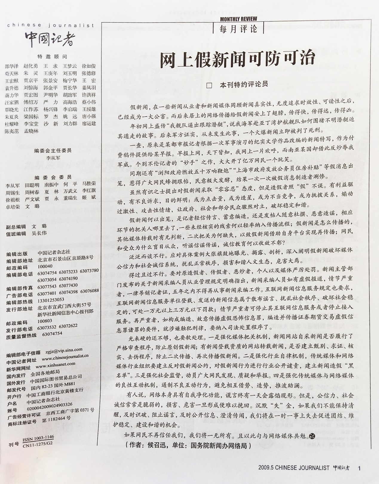 《中國記者》雜志2009年第5期“每月評(píng)論”刊發(fā)《網(wǎng)上假新聞可防可治》。