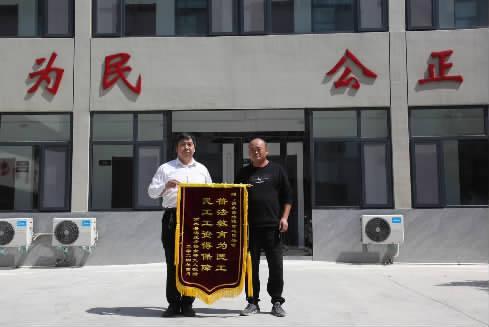 圖為“五一”假期期間,當事人李某為河南省商水縣人民法院城關(guān)人民法庭庭長訾連國(左)送來了錦旗。資料圖片