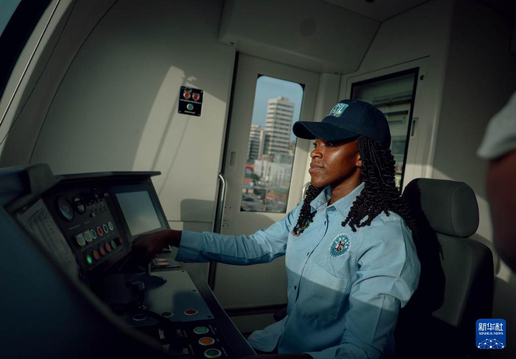 8月12日,在尼日利亞拉各斯,拉各斯輕軌藍(lán)線項(xiàng)目動(dòng)車組列車司機(jī)組長伊莎貝拉·亞當(dāng)斯·伊斯拉埃爾在輕軌列車上工作。新華社發(fā)(中土集團(tuán)尼日利亞有限公司供圖)