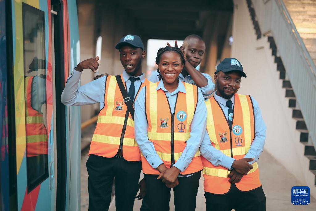 6月12日,在尼日利亞拉各斯,拉各斯輕軌藍(lán)線項(xiàng)目動(dòng)車組列車司機(jī)組長伊莎貝拉·亞當(dāng)斯·伊斯拉埃爾(中)與同事在站臺(tái)上合影。新華社發(fā)(中土集團(tuán)尼日利亞有限公司供圖)