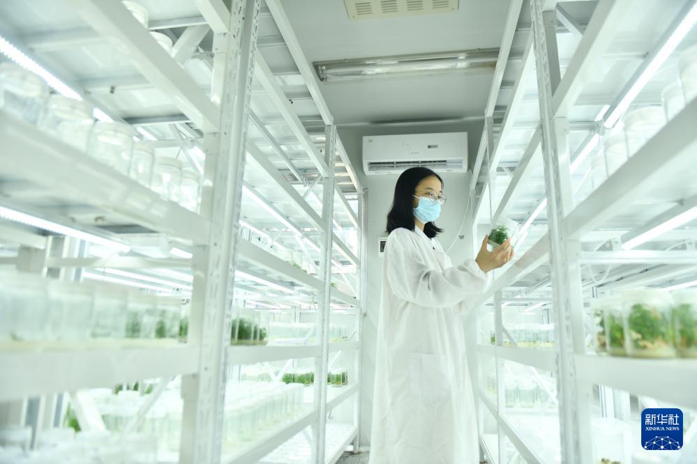 在廣西仙草堂制藥有限責(zé)任公司,技術(shù)人員在培育青蒿苗(8月27日攝)。