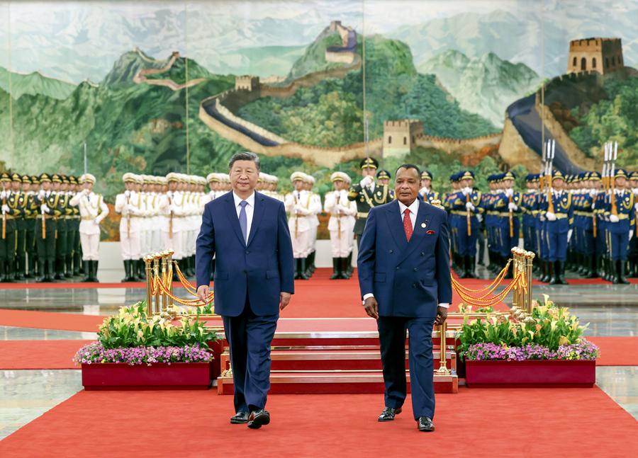 9月6日上午,國家主席習(xí)近平在北京人民大會堂同來華出席中非合作論壇北京峰會并進(jìn)行國事訪問的剛果(布)總統(tǒng)薩蘇舉行會談。這是會談前,習(xí)近平在人民大會堂北大廳為薩蘇舉行歡迎儀式。