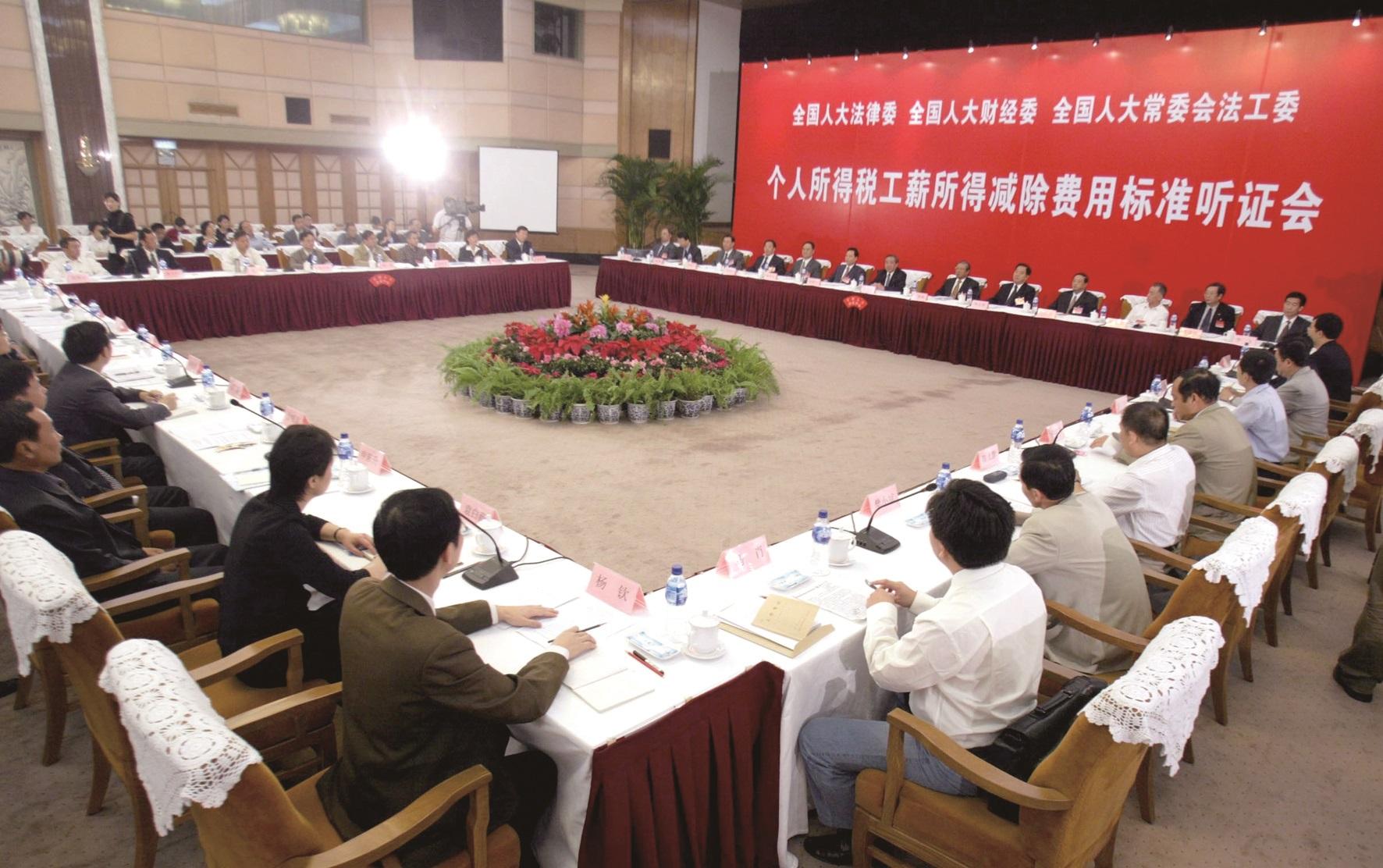 2005年9月27日,全國(guó)人大及其常委會(huì)歷史上第一次立法聽(tīng)證會(huì)在北京舉行。 新華社發(fā)