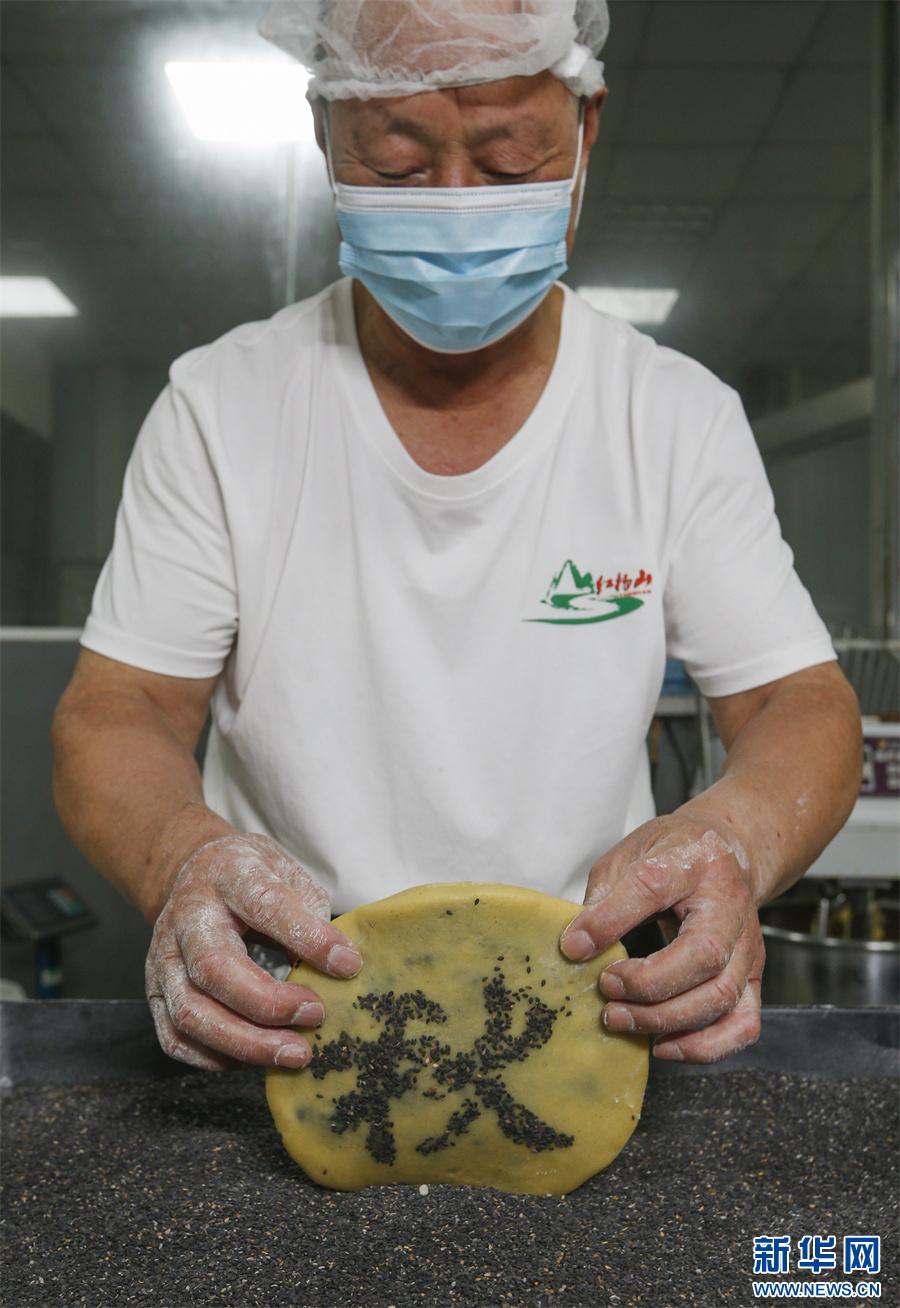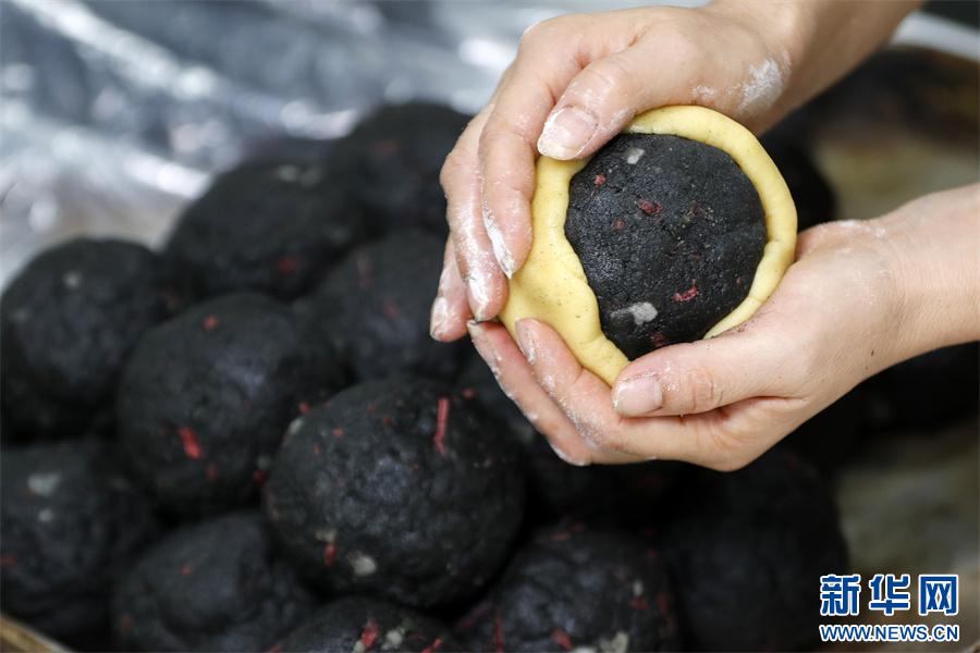 近日,制餅手藝人將月餅搖勻上白芝麻。
