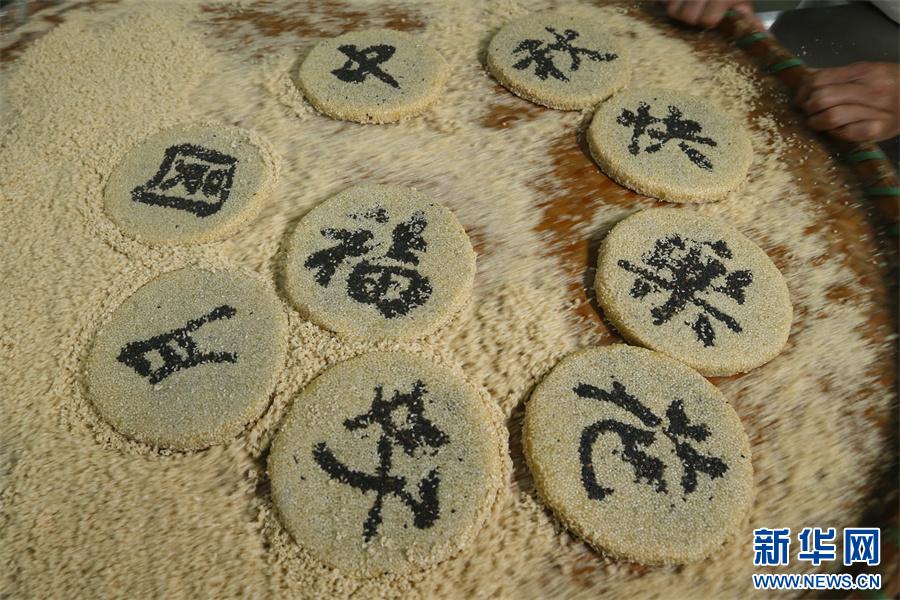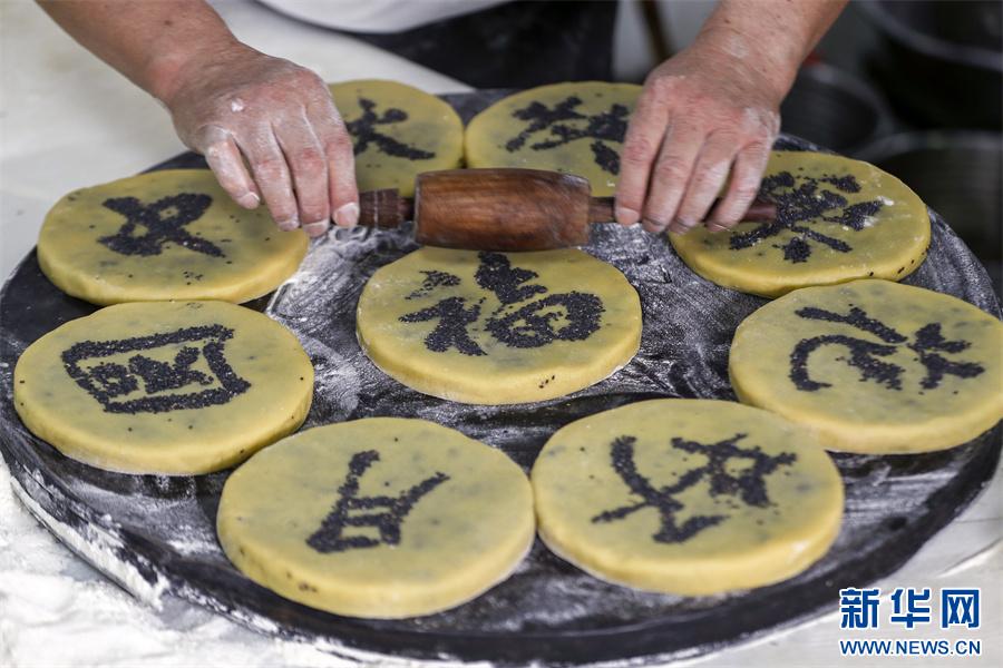 近日,徽州制餅手藝人給月餅上的字沾上黑芝麻。