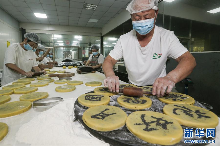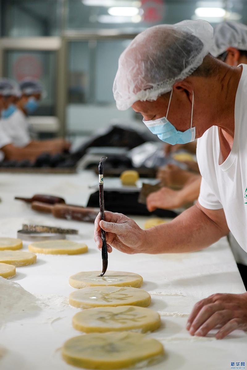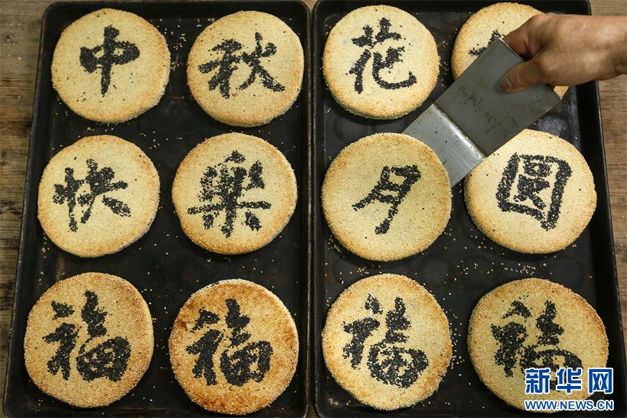 臨近中秋佳節(jié),在安徽省黃山市祁門縣,徽州制餅手藝人經(jīng)過“配料、打面皮、包餡、壓形、寫字、粘黑芝麻、上白芝麻和烘烤”等古法工序后,制成可食可賞的“徽州月餅”,深受食客喜愛。