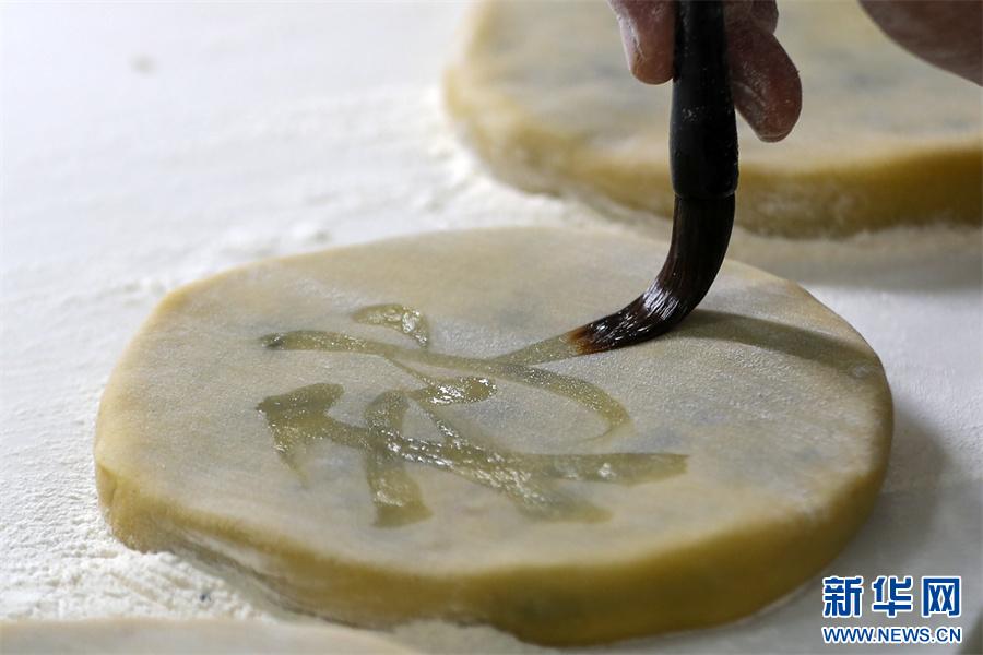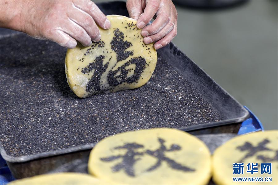 近日,制餅手藝人給月餅上的字沾上黑芝麻。
