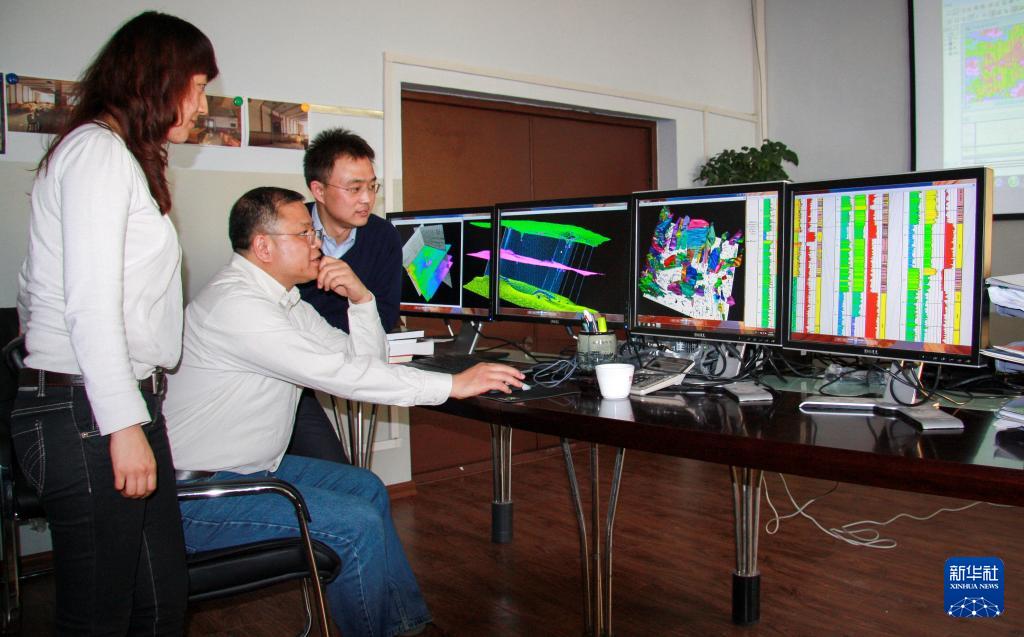 黃大年(左二)帶領(lǐng)科研團(tuán)隊成員研究問題(2010年11月22日攝)。 新華社發(fā)