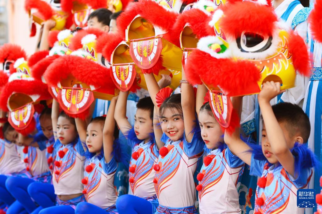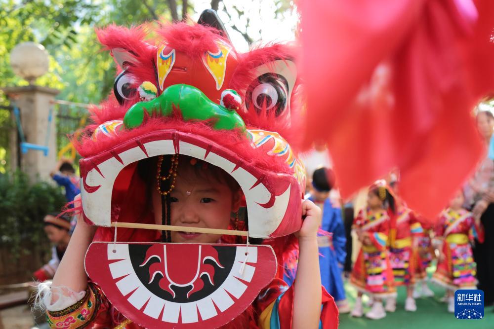 9月27日,小朋友在山東省棗莊市一幼兒園迎國(guó)慶活動(dòng)上舞獅。