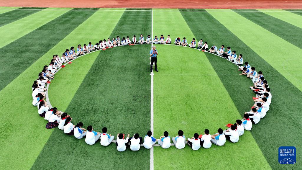9月27日,在四川省南充市蓬安縣錦屏鎮(zhèn)中心小學(xué)校迎國(guó)慶主題活動(dòng)上,師生與國(guó)旗合影(無人機(jī)照片)。