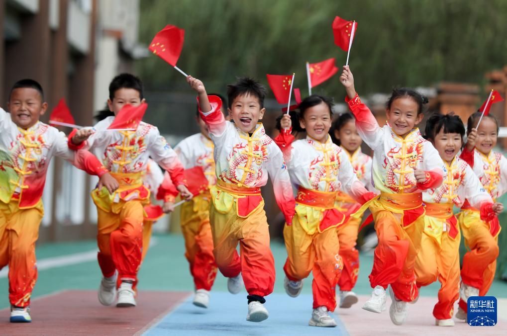 9月27日,在貴州省開陽縣第二幼兒園舉行的喜迎國(guó)慶活動(dòng)中,小朋友揮舞國(guó)旗開心奔跑。